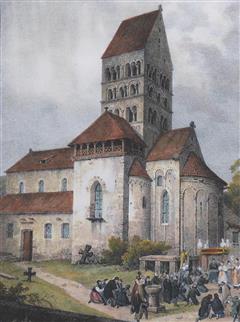 "L'ancienne église romane et son cimet,ière", lithographie d'Engelmann d'après un dessin de Bichebois et d'Adam, dans «Antiquités de l'Alsace» de Golbéry et Schweighaeuser, Mulhouse, 1828 [coll.part.]